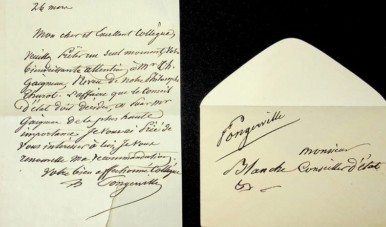 Jean-Baptiste Sanson de Pongerville (1782-1870), poète, écrivain, traducteur, membre de l'Académie française. L.A.S., 26 mars, 1p in-12. A Alfred Blanche (1816-1893), conseiller d'état. Recommandation pour le neveu du philosophe Jean-François Thurot, M. Th Gaigneau. Déchirure sans manque au niveau de la signature. [180]