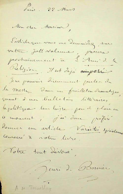 Henri de Bornier (1825-1901), poète, écrivain, membre de l'Académie française. L.A.S., 22 mars [1861], 1p in-8. A Louis Tremblay, à propos des articles qu'il va faire sur son ouvrage Ce que c'est que la messe. [180b]