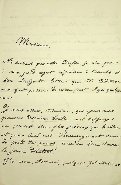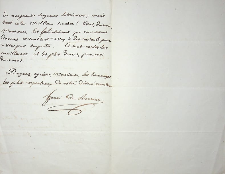 Henri de Bornier (1825-1901), poète, écrivain, membre de l'Académie française. L.A.S., sd [1845], 1p 1/2 in-8. Belle lettre au moment de la publication d'un de ses premiers ouvrages, Premières feuilles, à l'écrivain Sainte-Beuve. « Je vous assure, Monsieur, que pour mes pauvres Premières Feuilles, nul souffre ne pouvait être plus précieux que le vôtre et qu'un seul mot d'encouragement venu du poète des amours a rendu bien heureux le jeune débutant. J'ai reçu, il est vrai, quelques félicitations de nos grands seigneurs littéraires ; mais tout cela est-il bien sincère ? Vous, du moins, Monsieur, les félicitations que vous nous donnez ressemblent assez à des conseils pour n'être pas suspectes. Ce sont certes les meilleurs et les plus douces, . pour moi du moins ». Bornier fait référence au recueil de poèmes de Sainte-Beuve Livre d'amour publié en 1843. Très belle lettre du jeune poète. [180b]