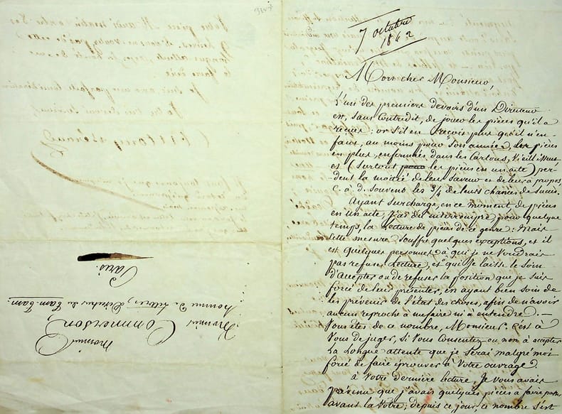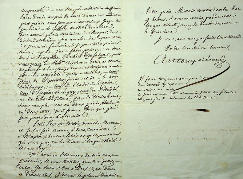 Antony Béraud (1792-1860), poète, écrivain, chansonnier, historien, militaire (officier de Saint-Cyr). L.A.S., 7 octobre 1842, 2p 1/2 in-8. A Jean-Louis-Auguste Commerson (1803-1879), écrivain, journaliste. Belle lettre pour lui annoncer ses difficultés à passer au théâtre de l'Ambigu-Comique, dont il est directeur, toutes les pièces en un acte qu'on lui propose. Il lui explique longuement la situation et se dit prêt à jouer sa pièce dès que possible. Peu commun. [180b]
