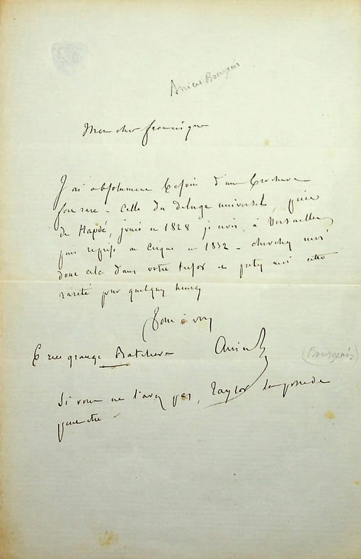 Auguste Anicet-Bourgeois (1806-1871), écrivain. L.A.S., sd, 1p in-8. A un ami, Francisque, espérant trouver une pièce, qualifiée de « rareté » dans ses trésors. « si vous ne l'avez pas, Taylor la possède peut-être ». [180b]