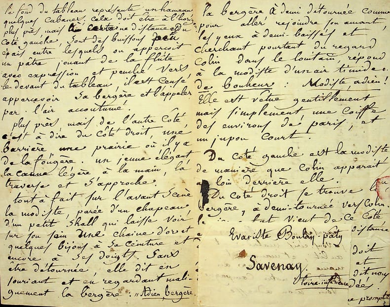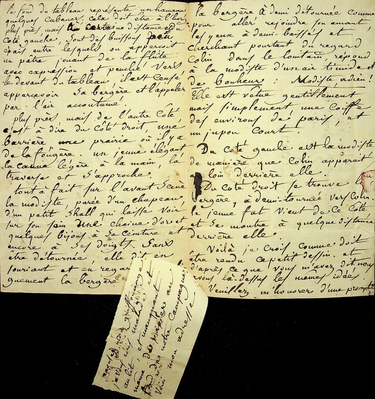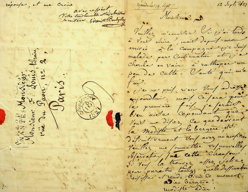 Evariste Boulay-Paty (1804-1864), poète romantique. L.A.S., 12 septembre 1827, 3p in-8. Au libraire F. Louis, à Paris (rue du Paon). Belle lettre à propos d'une de ses chansons, titrée La Modiste et la Bergère, pour laquelle il souhaite savoir s'il a trouvé un musicien. Si elle est publiée, il lui indique comment illustrer la chanson en donnant de nombreux détails. Il ajoute un petit papillon avec son adresse. Très belle lettre sur ce projet resté inédit. [180b]