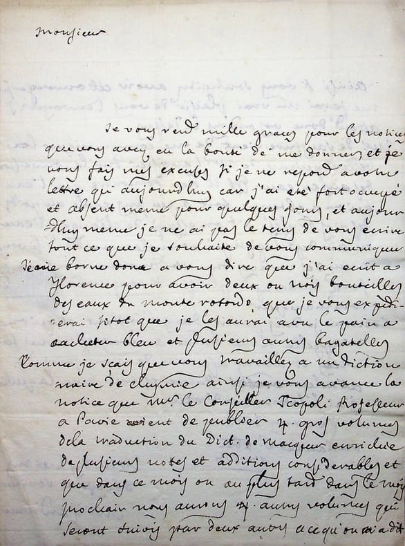 Marsilio Landriani (1751-1815), physicien, chimiste, météorologue italien. L.A.S., Milan, 6 décembre 1783, 2p in-4. Au chimiste et homme politique Louis-Bernard Guyton de Morveau (1737-1816) : « Monsieur, Je vous rends mille grâces pour les notices que vous avez eu la bonté de me donner et je vous fais mes excuses si je ne réponds à votre lettre qu'aujourd'hui car j'ai été fort occupé et absent même pour quelques jours, et aujourd'hui même je n'ai pas le temps de vous écrire tout ce que je souhaite [de] vous communiquer. Je me borne donc à vous dire que j'ai écrit à Florence pour avoir deux ou trois bouteilles des eaux du Monte Rotondo que je vous expédierai sitôt que je les aurai avec le pain à [mot illisible] bleu et plusieurs autres bagatelles. Comme je sais que vous travaillez à un dictionnaire de chimie. Aussi je vous avance la notice que Mr le conseiller [Giovanni Antonio] Scopoli professeur à Pavie vient de publier 4 gros volumes de la traduction du Dict. de Macquer enrichie de plusieurs notes et additions considérables et qua dans ce mois ou au plus tard dans le mois prochain nous aurons 4 autres volumes qui seront suivis par deux autres à ce qu'on m'a dit. Ainsi, si vous souhaitez avoir cet ouvrage, je me ferai un vrai plaisir de vous l'envoyer. J'attends donc vos ordres là-dessus. Mr [Nicolas Théodore] de Saussure vient de me communiquer la belle expérience de Mr Lavoisier sur la conversion des airs en eau. Et il a eu démontré que l'eau qu'on a obtenu soit à peu près égale au poids des airs brulés. A-t-on essayé de changer l'eau en air déphlogistiqué et inflammable. Si vous avez des notices sur cette matière, vous me ferez beaucoup de plaisir si vous voudrez me les communiquer. Comme je dois partir dans l'instant et qu'on m'appelle, je me borne à vous offrir mes services et à vous assurer de mon parfait attachement et sincère estime avec laquelle j'ai l'honneur d'être de vous Mr, votre humble et très obéissant serviteur M Landriani ». Cette lettre est très intéressante car elle est en pleine révolution chimique. Landriani parle déjà de la découverte de Lavoisier qui montre que la combustion de « l'air inflammable » (hydrogène) et de « l'air déphlogistiqué » (oxygène) produit de l'eau. Landriani se demande si on a tenté l'expérience inverse. On notera qu'il utilise encore les anciens noms de ces éléments, signe que la phlogistique n'a pas encore disparu. Sa demande concerne donc une expérience qui ne sera réussie qu'en 1800 : l'électrolyse de l'eau. Très belle lettre scientifique. [184]