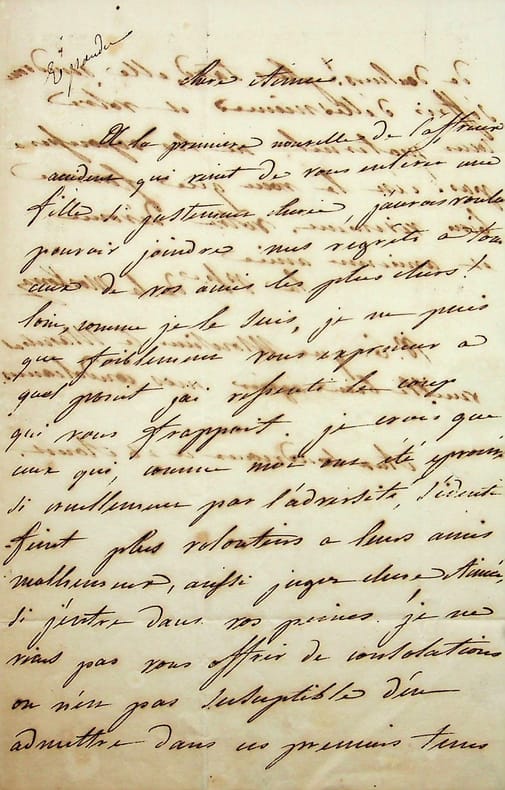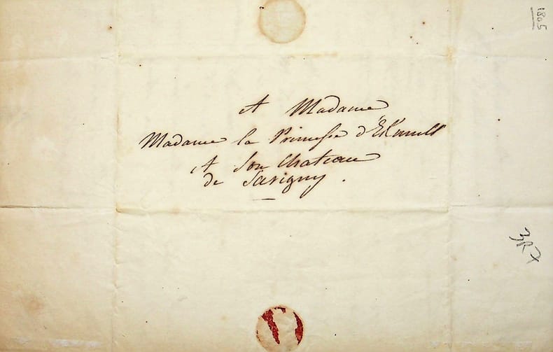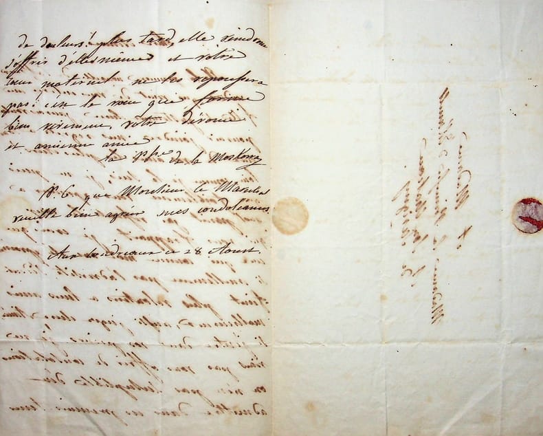 Aglaé Auguié (1782-1854), dame de compagnie des deux impératrices, épouse du maréchal Ney, princesse de la Moskowa. L.A.S., Les Coudreaux (Eure-et-Loir), 28 août [1805], 1pœ in-8. A Aimée Leclerc (1782-1868), épouse du maréchal Davout, princesse d'Eckmuhl : « Chère Aimée, A la première nouvelle de l'affreux accident qui vient de vous enlever une fille si justement chérie, j'aurais voulu pouvoir joindre mes regrets à tous ceux de vos amis les plus chers ! Loin, comme je le suis, je ne puis que faiblement vous exprimer à quel point j'ai ressenti le coup qui vous frappait. Je crois que ceux qui, comme moi, ont été éprouvés si cruellement par l'adversité, s'identifient plus volontiers à leurs amis malheureux, aussi jugez chère Aimée si j'entre dans vos peines. Je ne viens pas vous offrir de consolation, on n'est pas susceptible d'en admettre dans ces premiers temps de douleurs ! Plus tard, elles viendront s'offrir d'elles-même et votre coeur maternel ne les repoussera pas ! C'est le voeu que forme bien vivement votre dévouée et ancienne amie la princesse de la Moskowa. P.S. que Monsieur le Maréchal veuille bien agréer mes condoléances ». Le couple Davout, marié en 1801, eut un fils, Paul, puis une fille, Joséphine, morts tous deux à un an, cette dernière en 1805. Petite note « répondu » certainement de la main de la princesse d'Eckmuhl. Belle lettre amicale de condoléances. [184]