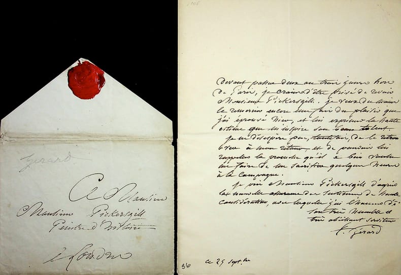 François Gérard (1770-1837), peintre, portraitiste. L.A.S., Paris, 25 septembre [1831?], 1p in-8. Au peintre anglais, lui aussi portraitiste, Henry-William Pickersgill (1782-1875) lors de son séjour parisien : « Devant passer deux ou trois jours hors de Paris, je crains d'être privé de revoir Monsieur Pickersgill. Je veux du moins le remercier encore une fois du plaisir que j'ai éprouvé hier, et lui exprimer la haute estime que m'inspire son beau talent. Je ne désespère pas, toutefois, de le retrouver à mon retour, et de pouvoir lui rappeler la promesse qu'il a bien voulu me faire de me sacrifier quelques heures à la campagne. je vous prie, Monsieur Pickersgill, d'agréer la nouvelle assurance des sentiments de haute considération, avec laquelle j'ai l'honneur d'être son très humble et très obéissant serviteur. F. Gérard ». On joint une façade d'enveloppe, adressée au même mais à Londres. Pickersgill a fait un voyage à Paris en 1831. C'est probablement à cette occasion que les deux peintres se sont rencontrés. Joli document. [184]