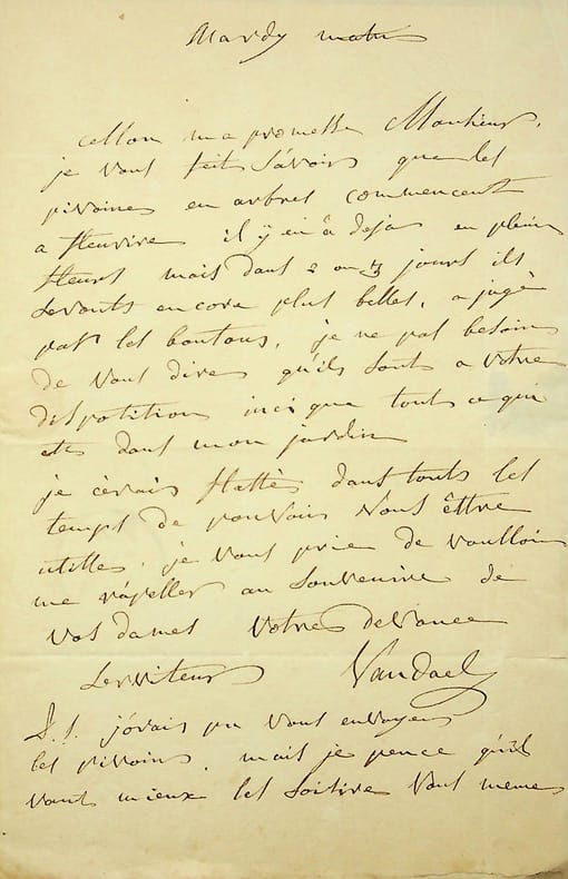 Jan-Frans dit Jean-François Van Dael (1764-1840), peintre flamand. L.A.S., 30 mai 1837, 1p in-8. A M. Brienne, employé à l'hôtel de la monnaie. Orthographe fantaisiste (transcription corrigée). « Selon ma promesse, Monsieur, je vous fais savoir que les pivoines en arbres commencent à fleurir. Il y en a déjà en pleines fleurs mais dans 2 ou 3 jours, elles seront encore plus belles, à juger par les boutons. Je n'ai pas besoin de vous dire qu'ils sont à votre disposition ainsi que tout ce qui est dans mon jardin. Je serais flatté dans tous les temps de pouvoir vous être utile. Je vous prie de vouloir me rappeler au souvenir de vos dames. Votre dévoué serviteur Van Dael. P.S. J'aurais pu vous envoyer les pivoines mais je pense qu'il faut mieux les saisir vous même ». Rare autographe. [184]