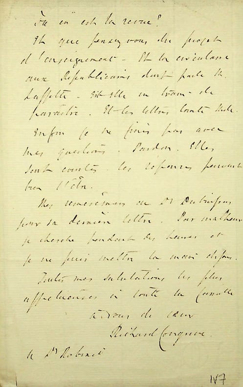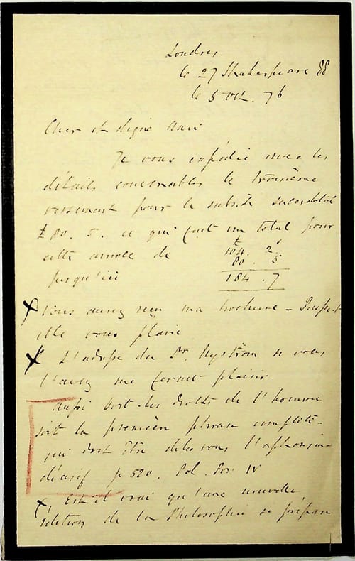[Positivisme] Richard Congreve (1818-1899), philosophe anglais, figure de proue du positivisme en Angleterre, à l'origine du schisme en 1878. L.A.S. en français, Londres, 27 Shakespeare 88 [5 octobre 1876], 2p in-8. Au docteur Jean-François Robinet (1825-1899), médecin d'Auguste Comte et important positiviste français. « Cher et digne ami, Je vous expédie avec les détails convenables le troisième versement pour le subside sacerdotal £80.5 ce qui fait un total pour cette année de £184.7 jusqu'ici. Vous aurez reçu ma brochure. Puisse-t-elle vous plaire. L'adresse du docteur Nyström si vous l'avez me ferait plaisir. Aussi [mot illisible] les droits de l'homme soit la première phrase complète qui doit être, dites-vous, l'aphorisme décisif p.520 [mots illsibles]. Est-il vrai qu'une nouvelle relation de la philosophie se prépare? Où en est la revue ? Et que pensez-vous du projet d'enseignement. Et la circulaire aux républicains dont parle M. [Pierre] Laffitte. Est-elle en train de paraître ? Et les lettres Comte Mill. Enfin, je ne finis pas avec mes questions. Pardon. Elles sont courtes. Les réponses pourront bien l'être. Mes remerciements au docteur Dubuisson pour sa dernière lettre. Par malheur, je cherche pendant des heures et je ne puis mettre la main dessus. Toutes mes salutations les plus affectueuses à toute la famille. A vous de coeur. Richard Congreve ». Le subside sacerdotal était la contribution que versaient les positivistes à destination de la France. Congreve cite les noms de plusieurs positivistes : Anton Kristen Nystrom (1842-1931) était un médecin suédois, propagateur du positivisme en Suède. Il ne suivra pas Congreve dans son schisme en 1878 ; Paul Dubuisson (1847-1908) est un médecin et psychiatre, gendre du docteur Robinet ; Pierre Laffitte (1823-1903) est un philosophe positiviste, successeur d'Auguste Comte. Les lettres « Comte Mill » sont les lettres d'Auguste Comte à John Stuart Mill qui seront publiées par Leroux en 1877. Les lettres entre positivistes sont rares. [184]