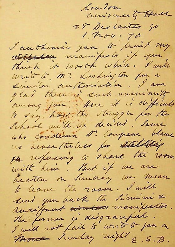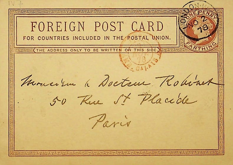 Edward Spencer Beesly (1831-1915), philosophe anglais, historien, militant syndical, positiviste. Elève de Richard Congreve, il rompt lors du schisme de 1878 et dirigera la London positivist Society à la suite de Congreve. L.A.S., 25 Descartes 90 [1er novembre 1878], 1p in-12. Au docteur Jean-François Robinet (1825-1899), médecin d'Auguste Comte et important positiviste français, sur carte postale : « I authorise you to print my manifeste if you think it worth while. I will write to Mr Lushington for a similar authorisation. I am glad there is such unanimity among you. Here it is difficult to say how the struggle for the school will be decided. Some who condemn Dr Congreve blame us nevertheless for refusing to share the room with him. But if we are beaten on Sunday, we mean to leave the room. I will send you back the Séméri & Audiffrent manifestus. The former is disgraceful. I will not fail to write to you on Sunday night. E.S.B. ». Essai de traduction : « Je vous autorise à imprimer mon manifeste si vous le jugez utile. J'écrirai à M. Lushington pour obtenir une autorisation similaire. Je suis heureux de constater une telle unanimité parmi vous. Ici, il est difficile de dire comment se décidera la lutte pour l'école. Certains qui condamnent le Dr Congreve nous reprochent néanmoins de refuser de partager la même pièce que lui. Mais si nous sommes battus dimanche, nous quitterons la pièce. Je vous renverrai le manifeste de Séméri et Audiffrent. Le premier est honteux. Je ne manquerai pas de vous écrire dimanche soir. » Cette lettre est intéressante car il s'agit ici de publier un manifeste contre Richard Congreve (1818-1899) qui était jusque là le chef du positivisme en Angleterre. C'est à ce moment-là que le schisme latent sera assumé. C'est au même moment que Sémérie et Audiffrent finissent de s'éloigner de la Société positiviste dont ils seront exclus en 1879. Parmi les noms cités : Godfrey Lushington (1832-1907) était un haut fonctionnaire anglais ; Eugène Sémérie (1832-1884) était un médecin, positiviste, proche du docteur Robinet ; Georges Audiffrent (1823-1909) était un médecin, positiviste, très proche d'Auguste Comte, il prendra la tête d'un schisme. Les lettres entre positivistes sont rares. [184]