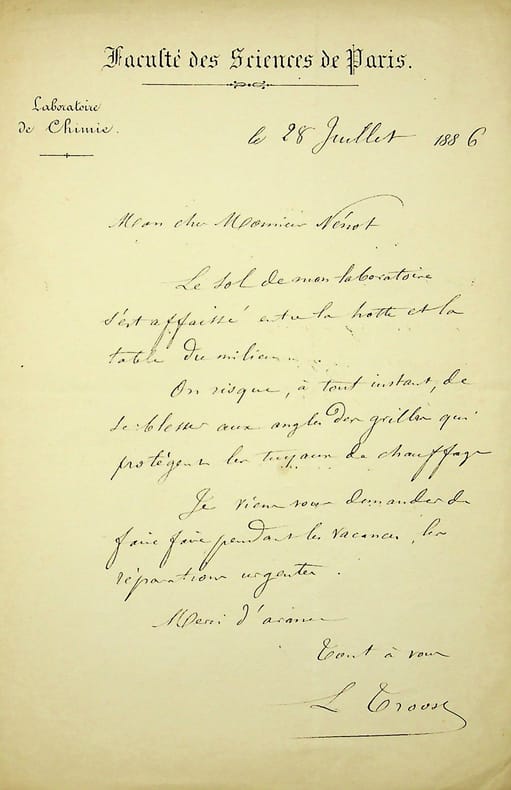 Louis Troost (1825-1911), chimiste, membre de l'Académie des Sciences dont il sera président. L.A.S., Paris, 28 juillet 1886, 1p in-8. A l'architecte Henri-Paul Nénot (1853-1934). « Mon cher Monsieur Nénot, Le sol de mon laboratoire s'est affaissé entre la hotte et la table du milieu. On risque, à tout instant, de se blesser aux angles des grilles qui protègent les tuyaux de chauffage. Je viens vous demander de faire faire pendant les vacances les réparations urgents. Merci d'avance. Tout à vous. L Troost ». Nénot avait en effet réalisé des bâtiments provisoires dont celui de l'Institut de Chimie. Peu commun. [184]