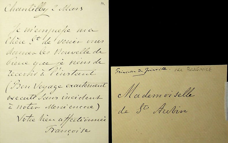 Françoise du Brésil (1824-1898), princesse de Joinville, épouse de François d'Orléans. L.A.S. + enveloppe (façade seule), Chantilly, 2 mars [ca.1890?], 1p in-12. A Mademoiselle de Saint-Aubin : « Je m'empresse ma chère St de venir vous donner les nouvelles de Pierre que je viens de recevoir à l'instant (Bon voyage, exactement exécuté sans incident à noter, merci encore). Votre bien affectionnée Françoise ». [184]