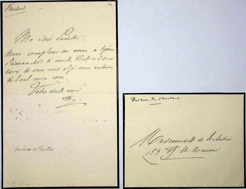 Françoise d'Orléans (1844-1925), duchesse de Chartres. L.A.S. + enveloppe (façade seule), sd [vendredi, ca.1900], œp in-8. A Mademoiselle de Saint-Aubin : « Ma chère Saintes, Nous comptons sur vous à déjeuner Dimanche à midi. Robert sera ravi de vous voir et je vous embrasse de tout mon coeur. Votre vieille amie FO ». Le liseré noir montre un deuil familial. Ses parents meurent en 1898 et 1900. [184]