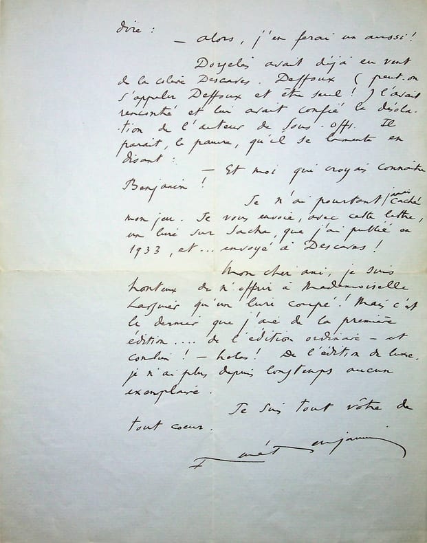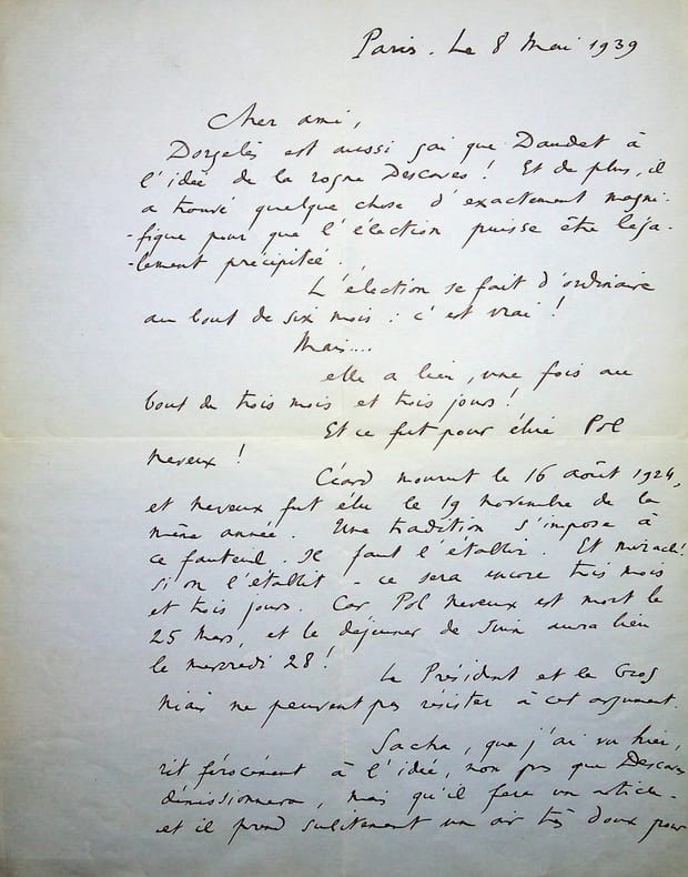 René Benjamin (1885-1948), écrivain, journaliste, prix Goncourt 1915, membre de l'Académie Goncourt. L.A.S., Paris, 8 mai 1939, 2p in-4. Au poète et écrivain Léo Larguier (1878-1950), alors secrétaire de l'Académie Goncourt, à propos du couvert de Paul Neveux : « Cher ami, Dorgelès est aussi gai que Daudet à l'idée de la rogne Descaves ! Et de plus, il a trouvé quelque chose d'exactement magnifique pour que l'élection puisse être légalement précipitée. L'élection se fait d'ordinaire au bout de six mois : c'est vrai ! Mais. Elle a lieu, une fois au bout de trois mois et trois jours ! Et ce fut pour élire Pol Neveux ! Céard mourut le 16 août 1924, et Neveux fut élu le 19 novembre de la même année. Une tradition s'impose à ce fauteuil. Il faut l'établir. Et miracle : si on l'établit - ce sera encore trois mois et trois jours. Car Pol Neveux est mort le 25 mars, et le déjeuner de juin aura lieu le mercredi 28 ! Le président et le Gros niais ne peuvent pas résister à cet argument. Sacha, que j'ai vu hier, rit férocement à l'idée, non pas que Descaves démissionnera, mais qu'il fera un article - et il prend subitement un air très doux pour dire : -Alors, j'en ferai un aussi ! Dorgelès avait déjà eu vent de la colère Descaves. Deffoux (peut-on s'appeler Deffoux et être seul !) l'avait rencontré et lui avait confié la désolation de l'auteur de Sous-offs. Il parait, le pauvre, qu'il se lamente en disant : -et moi qui croyais connaître Benjamin ! Je n'ai pourtant jamais caché mon jeu. Je vous envoie, avec cette lettre, un livre sur Sacha, que j'ai publié en 1933, et. envoyé à Descaves ! Mon cher ami, je suis honteux de n'offrir à mademoiselle Larguier qu'un livre coupé ! Mais c'est le dernier que j'aie de la première édition. de l'édition ordinaire - et combien ! - hélas ! De l'édition de luxe, je n'ai plus depuis longtemps aucun exemplaire. Je suis tout vôtre de tout coeur. René Benjamin ». Le point principal de cette lettre est la date de l'élection du nouveau membre, plus rapidement qu'à l'habitude, mais le cas s'était déjà produit pour l'élection de Neveux au deuxième couvert. L'élection de Sacha Guitry eut bien lieu le 28 juin 1939, par sept voix au second tour, seulement trois mois et trois jours après la mort de Neveux. On voit ici que l'élection était déjà jouée. Le « Gros Niais » est Jean Ajalbert que René Benjamin détestait. Très belle lettre. [184]