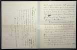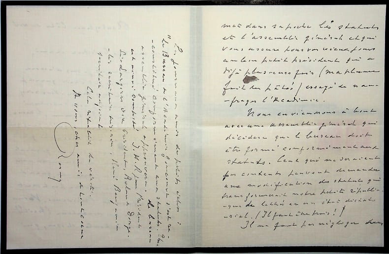 Séraphin Justin François Boex dit J.-H. Rosny jeune (1859-1948), écrivain, membre de l'Académie Goncourt. L.A.S. + enveloppe, Ploubazlanec, mars 1940, 3p in-8. Au poète et écrivain Léo Larguier (1878-1950), alors secrétaire de l'Académie Goncourt : « Mon cher vice-Président et ami, Non seulement je suis d'accord avec vous, mais je l'étais quand je vous ai écrit ma lettre. Vous rirez plus tard quand je vous raconterai cela en détail. En somme, le monstre va criant partout qu'il faut que je sois élu par une assemblée générale et que cette assemblée générale n'a pas le droit de nommer un autre président que moi parce que, quand je partirai, on n'aura pas le droit de lui refuser la présidence. Nous avons donc un dictateur (heil !) qui décide de toutes choses, qui met dans sa poche les statuts et l'assemblée générale et qui vous assure pour vos vieux jours un bon petit président qui a déjà plusieurs fois (ma plume fait des pâtés) essayé de naufrager l'Académie. Nous conviendrons à bout avec une assemblée générale qui décidera que le bureau doit être formé conformément aux statuts. Ceux qui ne seraient pas content peuvent demander une modification des statuts qui transformerait notre petite république des lettrés en un état dictatorial. (Il faut être trois !). Il ne faut pas négliger les journaux nourris de petits échos : "Le Bureau de l'Académie Goncourt s'est reconstitué conformément aux statuts. Une assemblée générale approuvera. Le bureau est ainsi constitué J.H.R jeune président, Léo Larguier vice Président, Roland Dorgelès secrétaire trésorier, René Benjamin secrétaire adjoint". Cela rétablit la vérité. A vous, cher ami, de tout coeur. Rosny ». Cette lettre montre les dissensions au sein de l'Académie Goncourt et notamment Descaves, le « monstre » et le « dictateur », qui veut imposer ses vues. Sur papier de deuil, son frère Rosny ainé, qui était président de l'Académie, étant mort le 15 février. La lettre n'est pas datée et le cachet est presque illisible. Rosny jeune devient donc le nouveau président. Belle lettre sur la succession de la présidence de l'Académie Goncourt. [184]