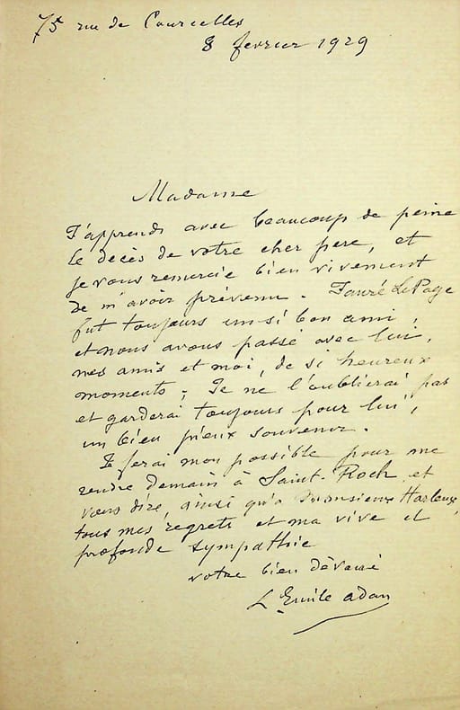 Louis-Emile Adan (1839-1937), peintre, illustrateur. L.A.S., 8 février 1928, 1p in-8. Belle lettre au moment de la mort de l'armurier Emile-Henry Fauré Le Page (1840-1929) à sa fille Hélène Harleux : « Madame, J'apprends avec beaucoup de peine le décès de votre cher père, et je vous remercie bien vivement de m'avoir prévenu. Fauré Le Page fut toujours un si bon ami, et nous avons passé avec lui, mes amis et moi, de si heureux moments. Je ne l'oublierai pas et garderai toujours pour lui un bien pieux souvenir. Je ferai mon possible pour me rendre demain à Saint Roch et vous dire, ainsi qu'à monsieur Harleux, tous mes regrets et ma vive et profonde stmpathie. Votre bien dévoué L.Emile Adan ». [185]