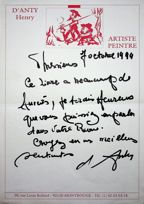 Henry d'Anty (1910-1998), peintre. L.A.S., Montrouge, 7 octobre 1994, 1p in-4. « Messieurs, Le livre a beaucoup de succès, je serais heureux que vous puissiez en parler dans votre Revue. Croyez en mes meilleurs sentiments. d'Anty ». [185]