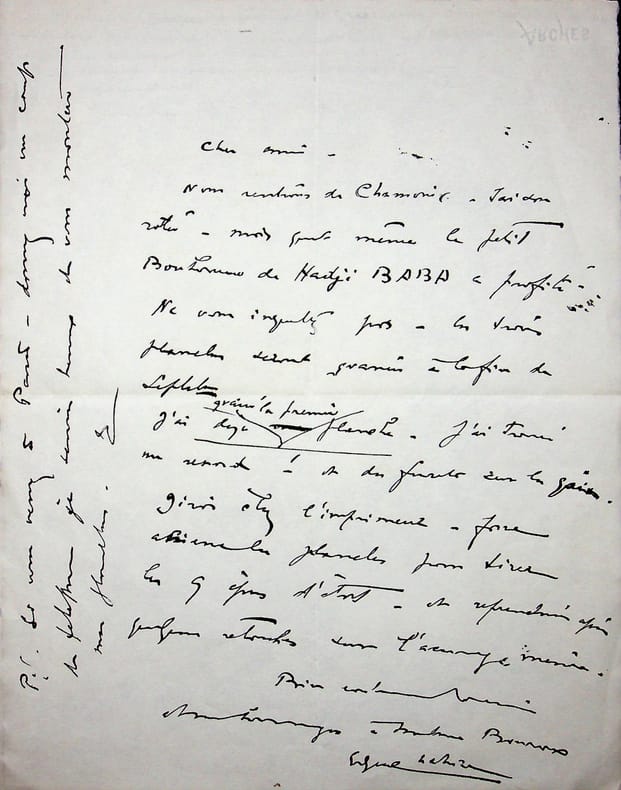 Edgar Chahine (1874-1947), peintre, graveur. L.A.S., sd [1931], 1p in-4. Au peintre Paul-Adrien Bouroux (1878-1967). « Cher ami, Nous rentrons de Chamonix - saison ratée - mais quand mêle le petit Bonhomme de Hadji BABA a profité. Ne vous inquiétez pas, les trois planches seront gravées à la fin de septembre. J'ai déjà gravé la première planche. J'ai trouvé un renard ! Et des furets sur la [mot illisible] chez l'imprimeur - [mot illisible] les planches pour tirer les 9 épreuves d'état et reprendrai après quelques retouches sur l'[mot illisible] même. Bien cordialement. Mes hommages à madame Bouroux. Edgar Chahine. P.S. : Si vous venez à Paris, donnez-moi un coup de téléphone, je serais heureux de vous montrer mes planches. E. ». Il s'agit de la préparation des gravures qu'il a fait pour Forêt voisine, de Maurice Genevoix, dans l'édition faite par la Société Saint Eloy, de Bouroux. Belle lettre, peu commun. [185]