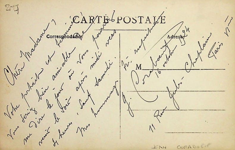 Jean Coraboeuf (1870-1947), peintre, graveur, grand prix de Rome 1898 en gravure. L.A.S., 16 octobre 1924, 1p in-12. « Chère Madame, Votre portrait est terminé, vous seriez bien aimable de me dire le jour où vous pourrez venir le voir après midi vers 4 heures, sauf samedi. Mes hommages très respectueux. J Coraboeuf ». Ce courrier est écrit sur une carte postale photographique représentant un portrait réalisé par Coraboeuf et daté 1923. Ce portrait est visible sur une photographie du peintre dans son atelier conservée dans les collections de l'ARRA à Ancenis sans qu'il ne soit identifié. [185]