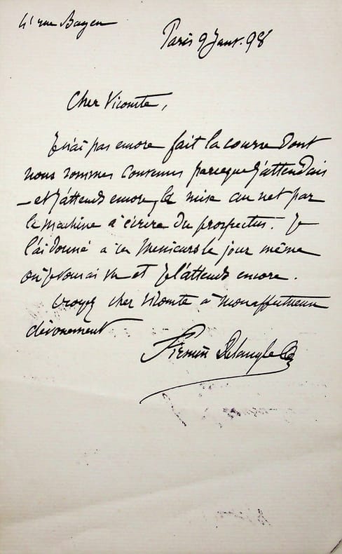 Firmin Delangle (1835-1905), peintre, dessinateur. L.A.S., 9 janvier 1898, 1p in-8. « Cher Vicomte, Je n'ai pas encore fait la courses dont nous sommes convenus parce que j'attendais et j'attends encore la mise au net par la machine à écrire du prospectus. Je l'ai donné à ces messieurs le jour-même où je vous ai vu et je l'attends encore. Croyez, mon cher Vicomte, à mon affectueux dévouement. Firmin Delangle ». [185]