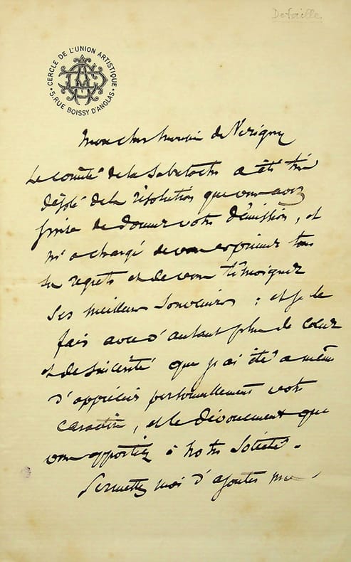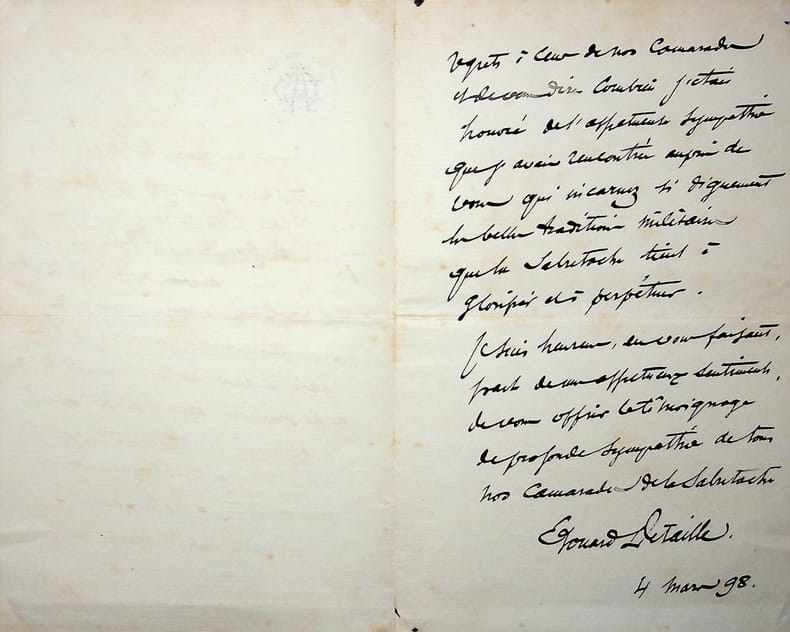 Edouard Detaille (1848-1912), peintre, illustrateur. L.A.S., 4 mars 1898, 2p in-8. A Arthur de la Chasse, marquis de Vérigny (1829-1898). « Le comité de la sabretache a été très désolé de la résolution que vous avez prise de donner votre démission, et m'a chargé de vous exprimer tous ses regrets et de vous témoigner ses meilleurs souvenirs. [.] Permettez-moi de vous dire combien j'étais honoré de l'affectueuse sympathie que j'avais rencontrée auprès de vous qui incarnez si dignement la belle tradition militaire que la sabretache tient à glorifier et à perpétuer ». Le marquis de Vérigny meurt quelques mois plus tard. Peut-être s'était-il retiré à cause d'une maladie. Très belle lettre amicale. [185]