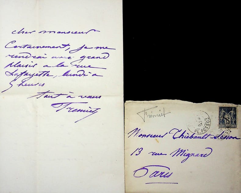 Emmanuel Frémiet (1824-1910), sculpteur. L.A.S. + enveloppe, 9 avril 1897, 1/2p in-8. Au critique d'art François Thiébault-Sisson (1856-1944). « Cher Monsieur, Certainement, je me rendrai avec grand plaisir à la rue Lafayette, lundi à 5 heures. Tout à vous. Frémiet ». [185]