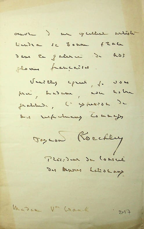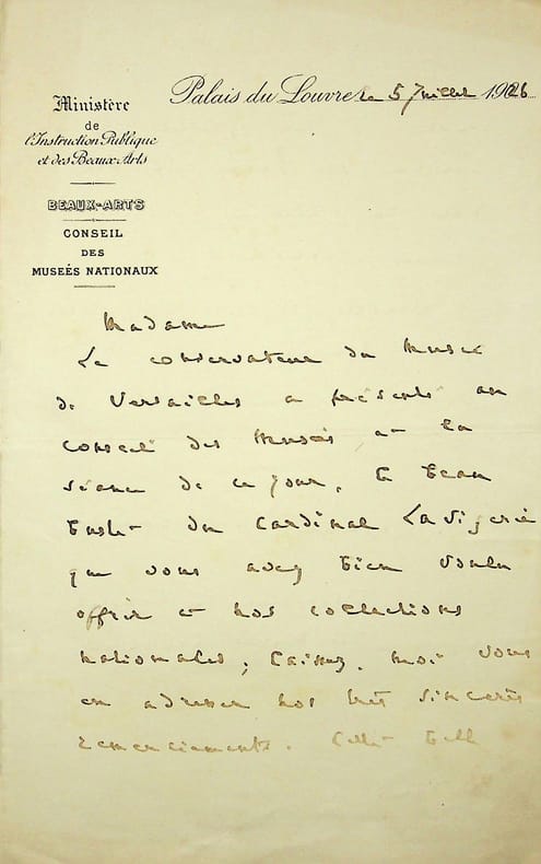 Raymond Koechlin (1860-1931), journaliste, collectionneur, président du conseil des Musées nationaux. L.A.S., Palais du Louvre, 5 juillet 1926, 2p in-8. « Madame, Le conservateur du Musée de Versailles a présenté au conseil des Musées, en la séance de ce jour, le beau buste du cardinal Lavigerie que vous avez bien voulu offrir à nos collections nationales. Laissez-moi vous en adresser nos très sincères remerciements. Cette belle oeuvre d'un excellent artiste tiendra sa bonne place dans la galerie de nos gloires françaises. Veuillez agréer, je vous prie, Madame, avec notre gratitude, l'expression de mes respectueux hommages. Raymond Koechlin ». La destinataire est la « veuve Franck »[?]. Le buste est peut-être le buste en marbre sculpté par Alexandre Oliva en 1887. [169]