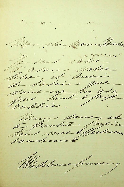 Madeleine Lemaire (1845-1928), peintre, illustratrice, salonnière. L.A.S., sd, 1p in-8. A l'écrivain Paul Hervieu (1857-1915). « Mon cher Monsieur Hervieu, Je suis ravie d'avoir votre livre et ainsi de savoir que vous ne m'avez pas tout à fait oubliée. Merci donc et à bien j'espère. Tous mes affectueux souvenirs. Madeleine Lemaire ». [169]