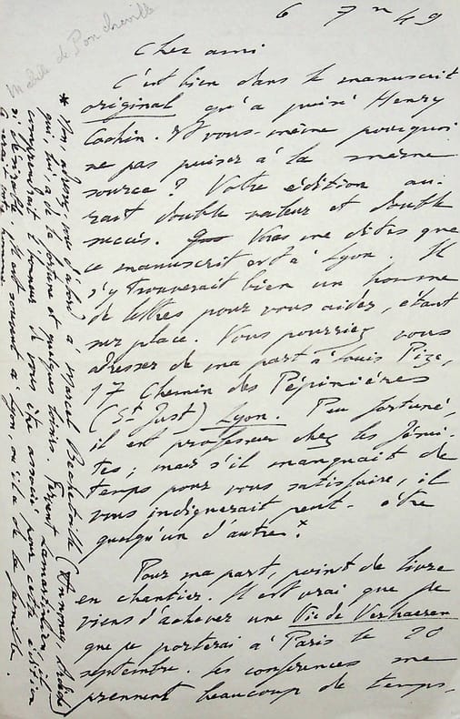 André Mabille de Poncheville (1886-1969), poète, écrivain. L.A.S., 6 septembre 1949, 2p in-8. Au peintre Paul-Adrien Bouroux (1878-1967). « Cher ami, c'est bien dans le manuscrit original qu'a puisé Henry Cochin. Et vous-même, pourquoi ne pas puiser à la même source ? Votre édition aurait double valeur et double succès. Vous me dites que la manuscrit est à Lyon. Il s'y trouverait bien un homme de lettres pour vous aider, étant sur place. Vous pourriez vous adresser de ma part à Louis Pize, 17 chemin des Pépinières (St Just) Lyon. Peu fortuné, il est professeur chez les Jésuites ; mais s'il manquait le temps pour vous satisfaire, il vous indiquerait peut-être quelqu'un d'autre. Non, adressez-vous d'abord à Marcel Bechetoille (Annonay, Ardèche) qui, lui, a de la fortune et quelques loisirs. Fervent lamartinien, il comprendrait l'honneur de vous être associé pour cette édition si désirable. Il est souvent à Lyon, où il a de la famille. Ce serait votre homme. Pour ma part, point de livre en chantier. Il est vrai que je viens d'acheter une Vie de Verhaeren que je porterai à Paris le 20 septembre. Les conférences me prennent beaucoup de temps, mais j'aurais tort de m'en plaindre. A Fontainebleau, pour les "Amis de F", je parlerai de Notre amie la Belgique, le 22. D'autres sujets me sont souvent demandés : le général Leclerc, héros cornélien ; Aspects de Van der Meersch, Aspects de Jules Romains, etc. Les vacances se passent agréablement pour nos enfants, plage, réunion, parties de campagne. Louise et Marie, parties à Lourdes à la mi-août, nous reviendrons seulement dans 2 ou 3 jours, ayant fait deux escales chez des parents sur le chemin du retour. Je vous joins la demande d'un exemplaire de Boulogne Belle et m'en rapporte à vous pour ne le lâcher qu'à un prix intéressant. Nous pensons souvent à madame Bouroux et à vous, regrettant - surtout ma femme qui bouge peu du foyer - que vous ne passiez plus sur notre côte. Qui sait, Paris sera peut-être une compensation, au moins pour celui de nous deux qui représente l'élément nomade. Donc, hommages. Amitiés. Croyez-moi, mon cher Bouroux, affectueusement vôtre A.M.P. Je serais bien curieux de voir vos "cuivres Lamartiniens" ». L'ouvrage de Lamartine est le Manuscrit de ma mère que Bouroux publiera en 1952 avec des eaux-fortes et un avant-propos du marquis de Luppé. Il semble donc que ni Bechetoille ni Pize n'ont participé à cette édition. Belle lettre. [169]
