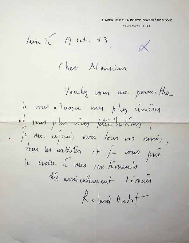 Roland Oudot (1897-1981), peintre, lithographe. L.A.S., 19 octobre 1953, 1p in-4. Au journaliste Maurice Noël (1901-1975). « Cher Monsieur, Voulez-vous me permettre de vous adresser mes plus sincères et mes plus vives félicitations. Je me réjouis avec tous vos amis, tous les artistes et je vous prie de croire à mes sentiments. Très amicalement dévoués. Roland Oudot ». [169]