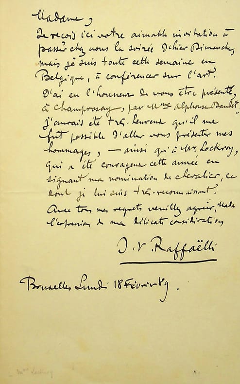 Jean-François Raffaëlli (1850-1924), peintre, sculpteur, graveur. L.A.S., Bruxelles, 16 février 1889, 1p in-8. A Alice Lehaene, épouse d'Edouard Lockroy. « Madame, Je reçois ici votre aimable invitation à passer chez vous la soirée d'hier dimanche, mais je suis toute cette semaine en Belgique, à conférencer sur l'art. J'ai eu l'honneur de vous être présenté, à Champrosay, par Mme Alphonse Daudet, j'aurais été très heureux qu'il me fût possible d'aller vous présenter mes hommages, ainsi qu'à Mr Lockroy, qui a été courageux cette année en signant ma nomination de chevalier dont je lui suis très reconnaissant. Avec tous mes regrets veuillez agréer, Madame, l'expression de ma délicate considération. J.F. Raffaëlli ». [169]