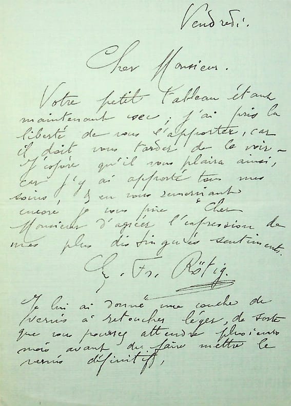 Georges-Frédéric Rötig (1873-1961), peintre, illustrateur. L.A.S., sd [vendredi], 1p in-8. Probablement à Charles Gadala (1839-1923), agent de change et collectionneur. « Cher Monsieur, Votre petit tableau étant maintenant sec, j'ai pris la liberté de vous l'apporter, car il doit vous tarder de le voir. J'espère qu'il vous plaira ainsi, et j'y ai apporté tous mes soins, & en vous remerciant encore, je vous prie, cher Monsieur, d'agréer l'expression de mes plus distingués sentiments. G-Fr. Rötig. Je lui ai donné une couche de vernis à retoucher léger, de sorte que vous pourrez attendre plusieurs mois avant de faire mettre le vernis définitif ». [169]