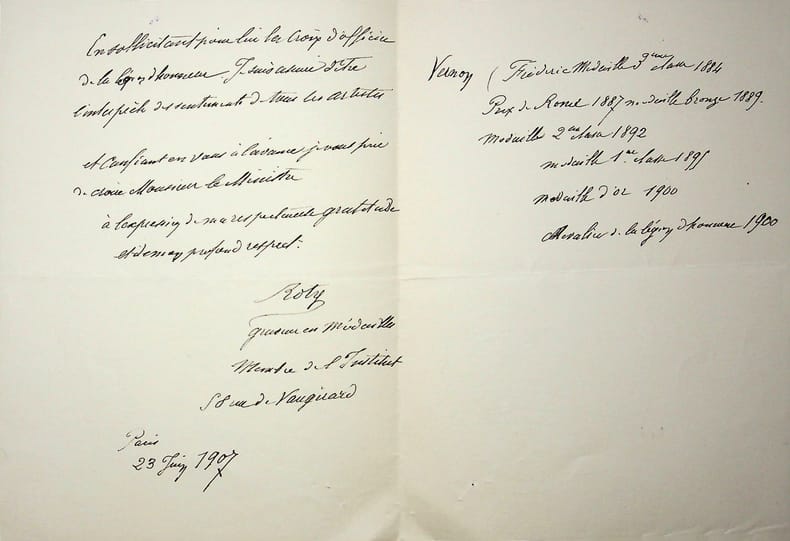 Oscar Roty (1846-1911), sculpteur, médailleur, grand prix de Rome 1875. L.A.S., 23 juin 1907, 2p 1/2 in-8. Belle lettre à Aristide Briand (1862-1932) afin d'obtenir la Légion d'Honneur pour le sculpteur Frédéric de Vernon (1858-1912) : « J'ai l'honneur de solliciter de votre justice la croix d'officier de la Légion d'Honneur pour un très grand artiste, graveur en médailles, Monsieur Vernon. Cet artiste déjà chargé par le gouvernement de nombreuses et importantes commandes et ayant obtenu précédemment les plus hautes récompenses au Salon a été honoré récemment à l'unanimité des exposants au Salon de la médaille d'honneur, extrême récompense rêvée par tous les artistes et qui prouve en quelle estime son talent est tenu par ses confrères [.] ». Il donne ensuite la liste des récompenses obtenues par Vernon. Cette recommandation ne semble pas avoir porté ses fruits. [169]
