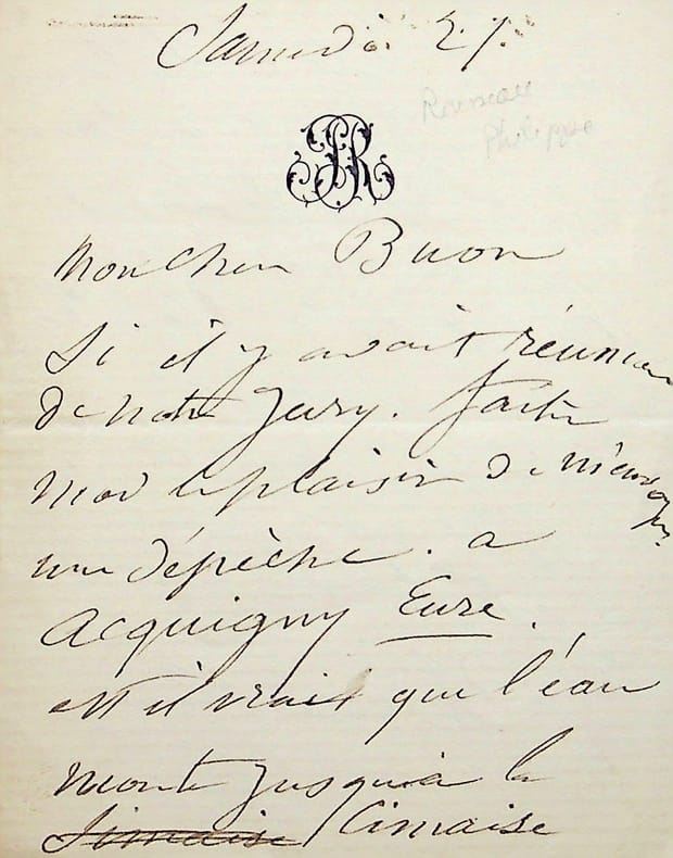 Philippe Rousseau (1816-1887), peintre. L.A.S., sd [samedi 27], 2p in-12. « Mon cher Buon, Si il y avait réunion de notre jury, faites-moi le plaisir de m'envoyer une dépêche à Acquigny Eure. Est-il vrai que l'eau monte jusqu'à la cimaise ? Dans ce cas-là seulement je vous prierai de faire monter mes tableaux avec le niveau d'eau. Ici, il fait très beau depuis 6 jours. Je dessine. Amitiés à Gro. et tout à vous. Ph Rousseau ». [169]