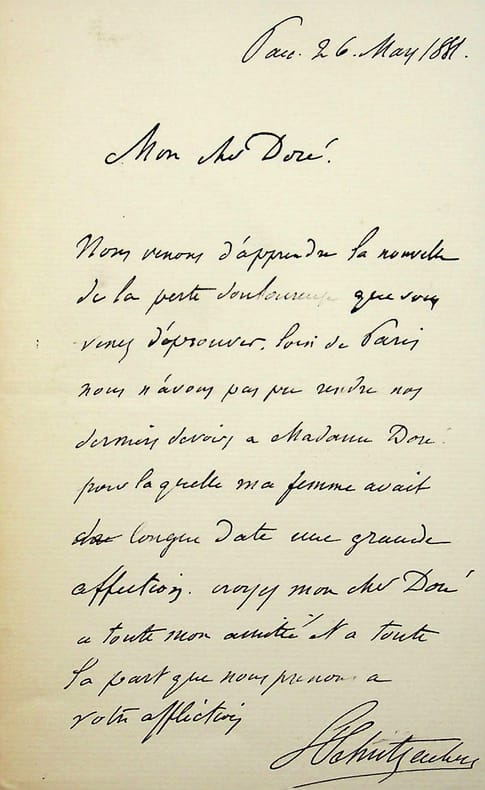 Louis Frédéric Schützenberger (1825-1903), peintre. L.A.S., Paris, 26 mars 1881, 1p in-8. Au peintre Gustave Doré (1832-1883). Belle lettre de condoléances suite au décès de la mère du peintre, le 15 mars 1881. Gustave Doré et sa maman avaient une relation fusionnelle. « Mon cher Doré, Nous venons d'apprendre la nouvelle de la perte douloureuse que vous venez d'éprouver. Loi de Paris, nous n'avons spas pu rendre nos derniers devoirs à Madame Doré pour laquelle ma femme avait de longue date une grande affection. Croyez mon cher Doré à toute mon amitié et à toute la part que nous prenons à votre affliction. LSchützenberger ». [169]
