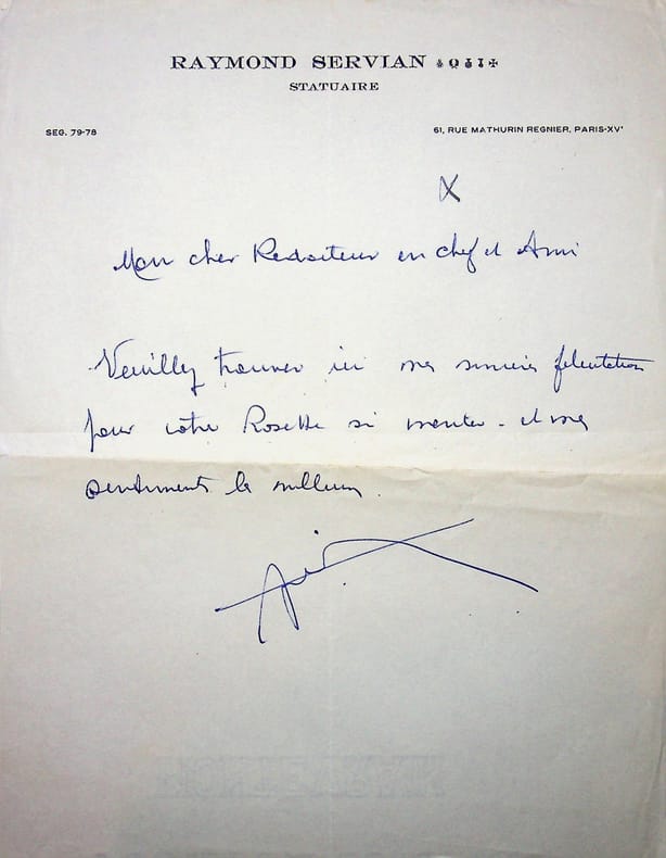Raymond Servian (1903-1953), statuaire, sculpteur. L.A.S., sd [1953], 1p in-4. Au journaliste Maurice Noël (1901-1975). « Mon cher Rédacteur en chef et Ami, Veuillez trouver ici mes sincères félicitations pour votre Rosette si méritée et mes sentiments les meilleurs. Servian ». Peu commun. [169]