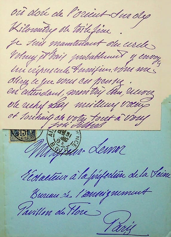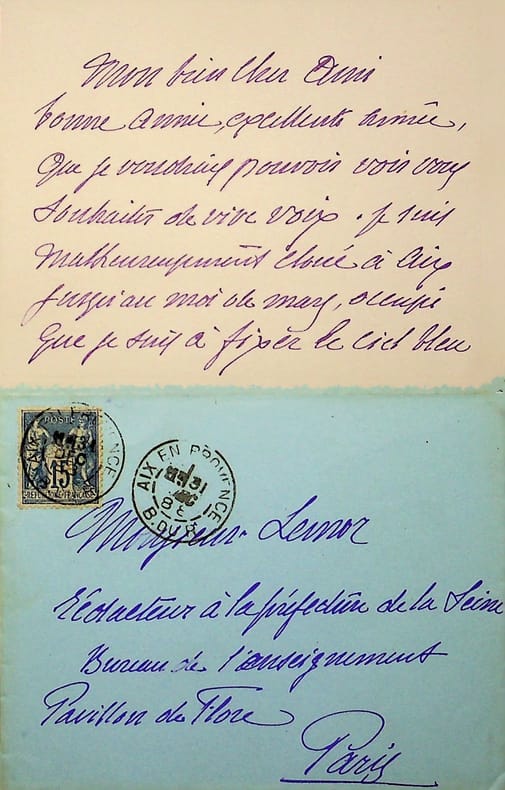 José Silbert (1862-1936), peintre. L.A.S. + enveloppe, Aix en Provence, 31 décembre 1888, 2p in-12. A Julien Lemor, rédacteur à la préfecture de la Seine. « Mon bien cher ami, Bonne année, excellente année, que je voudrais pouvoir voir vous souhaitez de vive voix. Je suis malheureusement cloué à Aix jusqu'au mois de mars, occupé que je suis à fixer le ciel bleu ou doré de l'Orient sur des kilomètres de toile fine. Je suis maintenant au cercle Volney et vais probablement y envoyer un crépuscule tunisien. Vous me direz ce que vous en pensez. En attendant, mon très cher, recevez de rechef mes meilleurs voeux et souhaits de votre tout à vous José Silbert ». [169]