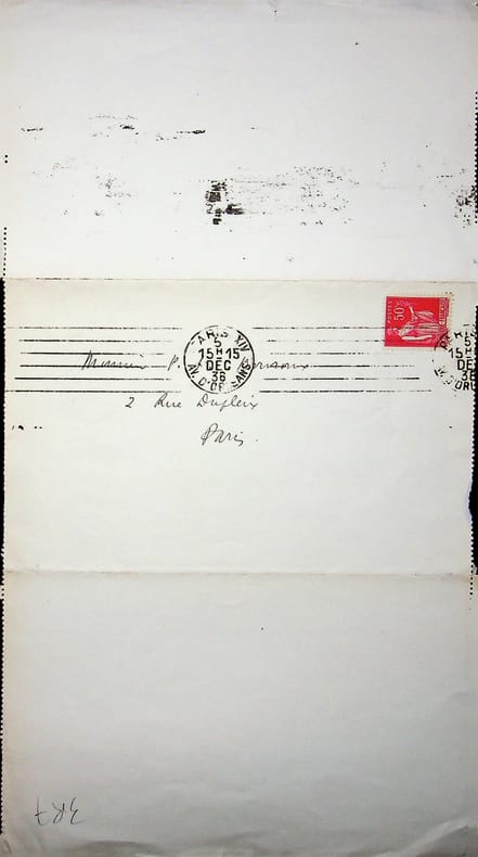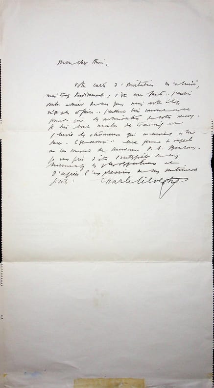 Charles Silvestre (1889-1948), écrivain. L.A.S., 15 décembre 1936, 1p in-8. Au peintre Paul-Adrien Bouroux (1878-1967). « Mon cher Ami, Votre carte d'invitation m'arrive, mais trop tardivement : c'est ma faute. j'aurais voulu admirer de mes yeux mais votre [mot illisible] n'est plus à faire. J'entends bien souvent avec grande joie des admirateurs de votre oeuvre. Je suis sous [mot illisible] de travail et j'envie les chômeurs qui m'envient à leur tour. C'est ainsi. Ma femme se rappelle au bon souvenir de madame P.A. Bouroux. Je vous prie d'être l'interprète de mes hommages les plus respectueux et d'agréer l'expression de mes sentiments fidèles. Charles Silvestre ». [169]