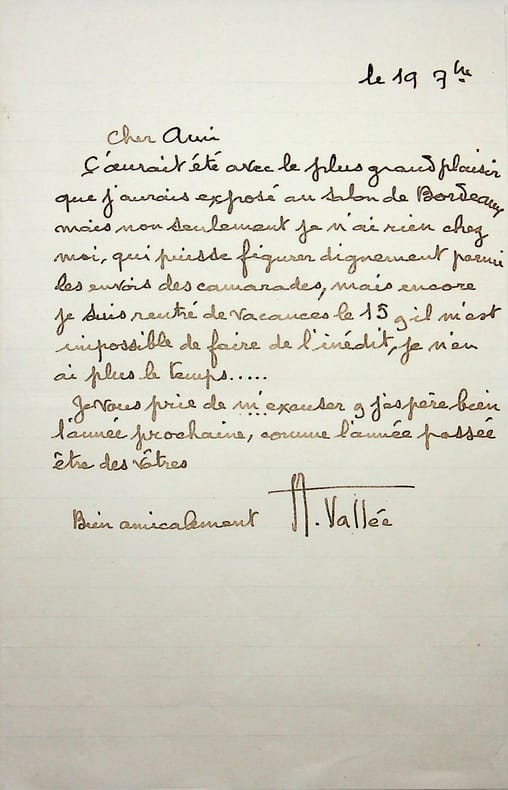 Armand Vallée (1884-1960), peintre. L.A.S., 19 septembre, 1p in-8. « Cher ami, Ç'aurait été avec le plus grand plaisir que j'aurais exposé au salon de Bordeaux mais non seulement je n'ai rien chez moi qui puisse figurer dignement parmi les envois des camarades, mais encore je suis rentré de vacances le 15 & il m'est impossible de faire de l'inédit, je n'en ai plus le temps. Je vous prie de m'excuser & j'espère bien l'année prochaine, comme l'année passée, être des vôtres. Bien amicalement. A Vallée ». [169]