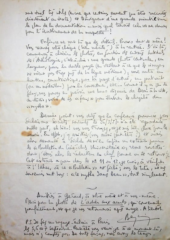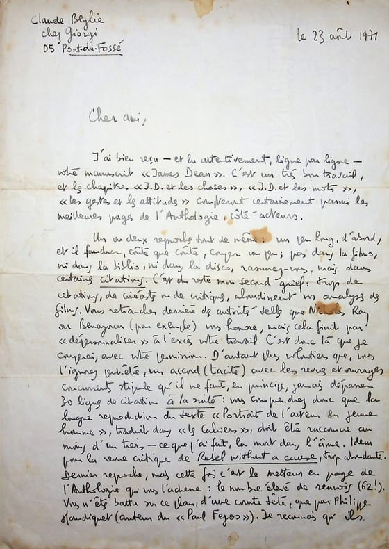 Claude Beylie (1932-2001), critique et historien du cinéma. L.A.S., Pont-du-Fossé, 23 août 1971, 2p in-4. Belle et longue lettre à Marceau Devillers (1938-?) à propos de l'ouvrage de Devilliers sur James Dean. Après avoir loué sur quelques lignes le manuscrit, il fait des reproches, assez longuement, les terminant par « Enfin, ce ne sont là que des détails. Bravo tout de même ! ». Beylie s'occupait d'une collection Anthologie du Cinéma. L'ouvrage sera publié dans la collection en 1972 et réédité en 1985 et en 2012. Intéressante lettre. [430]