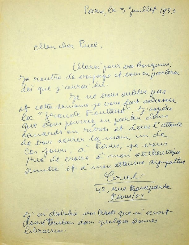 Gaston Criel (1913-1990), poète, écrivain. L.A.S., Paris, 5 juillet 1953, 1p in-4. Au poète de l'école de Rochefort Gaston Puel (1924-2013). Remerciements pour un envoi de livre. Il lui annonce l'envoi de son roman La Grande Foutaise. [431]