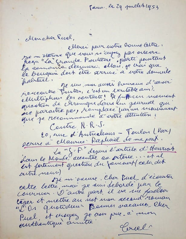 Gaston Criel (1913-1990), poète, écrivain. L.A.S., Paris, 29 juillet 1953, 1p in-4. Au poète de l'école de Rochefort Gaston Puel (1924-2013). Remerciements, envois de leurs livres respectifs et surtout son espoir de Goncourt pour la Grande Foutaise. De fait, on dit qu'il faillit avoir le Goncourt cette année-là. [431]