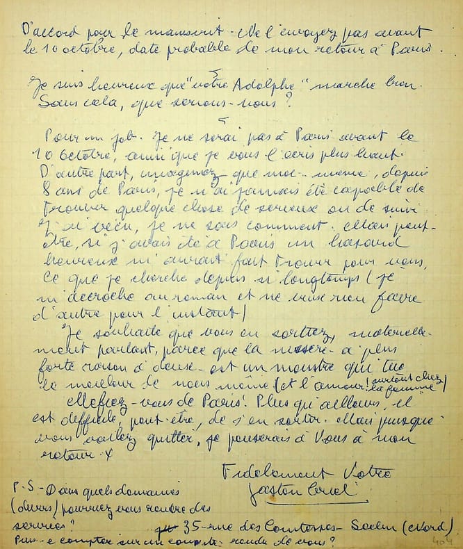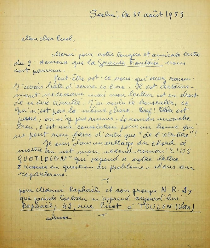 Gaston Criel (1913-1990), poète, écrivain. L.A.S., Seclin, 31 août 1953, 2p in-4. Au poète de l'école de Rochefort Gaston Puel (1924-2013). Belle lettre sur son roman, La Grande Foutaise, pour lequel il faillit avoir le prix Goncourt, et amicale. [431]