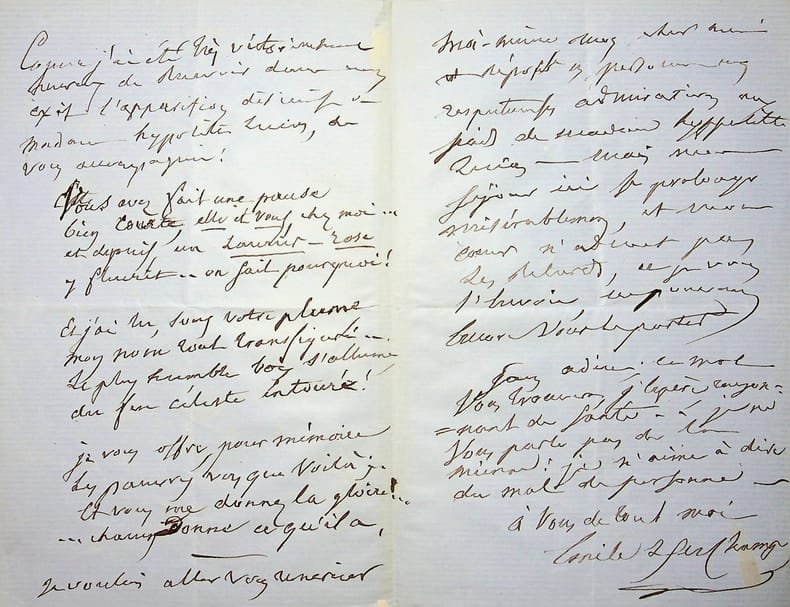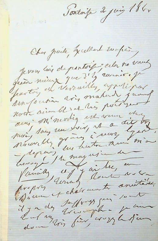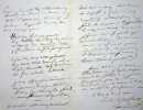 Emile Deschamps (1791-1871), poète. L.A.S., Pontoise 2 juin 1860, 3p in-8. A l'écrivain Hippolyte Lucas (1807-1878). « Cher poète, excellent confrère, Je vous écris de Pontoise, cela ne vaut aère mieux que d'en revenir. Je partais de Versailles, appelé par une cousine très malade quand votre aimable et très poétique ami, Mr M[illisible] est venu chez moi, sans me voir, et a dit vos nouvelles, grâce à mon égard. depuis un autre ami m'a envoyé le marquis de Pouilly, et j'ai lu, en proposer termes, toute votre bonne et charmante amitié. Il y a des suffrages qui sont tout un triomphe. Je suis donc très fier, croyez-le bien. Comme j'ai été très [mot illisible] heureux de recevoir dans mon exil l'apparition discrète de madame Hyppolite Lucas. ». Très belle lettre amicale. [431]