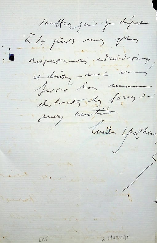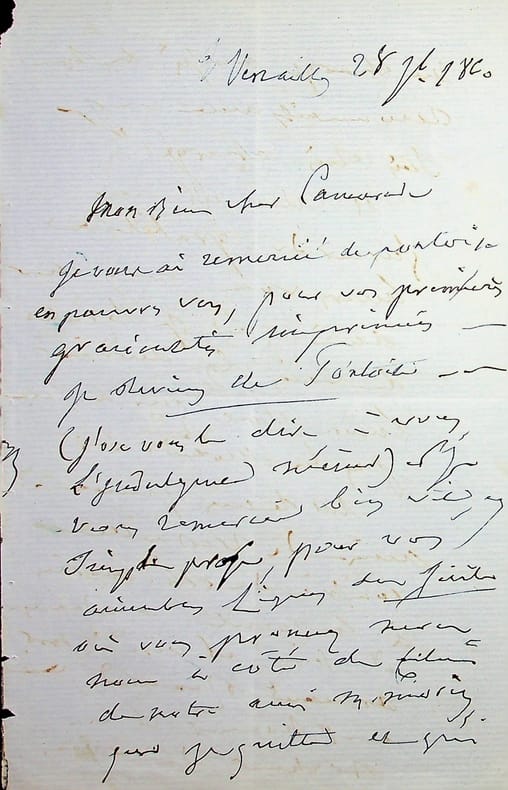 Emile Deschamps (1791-1871), poète. L.A.S., Versailles, 17 septembre 1874, 1p in-8. A l'écrivain Hippolyte Lucas (1807-1878). « Mon cher Lucas, les neiges, les brouillards, les rues, nous séparent, mais les amis se saluent [mots illisibles] à travers tout. Voici deux petites volumes, qu'un journal malhabile adresse en peine à ses abonnés. Auriez-vous la bonté de me dire un peu le contraire dans le [mot illisible]. Merci d'avance et à bientôt et à toujours. Votre ami Emile Deschamps. Respectueux hommage à madame Lucas ». [431]
