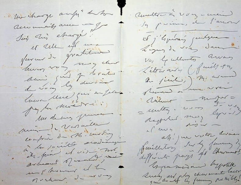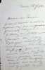 Emile Deschamps (1791-1871), poète. L.A.S., Pontoise 2 juin 1860, 3p in-8. A l'écrivain Hippolyte Lucas (1807-1878). « Cher poète, excellent confrère, Je vous écris de Pontoise, cela ne vaut aère mieux que d'en revenir. Je partais de Versailles, appelé par une cousine très malade quand votre aimable et très poétique ami, Mr M[illisible] est venu chez moi, sans me voir, et a dit vos nouvelles, grâce à mon égard. depuis un autre ami m'a envoyé le marquis de Pouilly, et j'ai lu, en proposer termes, toute votre bonne et charmante amitié. Il y a des suffrages qui sont tout un triomphe. Je suis donc très fier, croyez-le bien. Comme j'ai été très [mot illisible] heureux de recevoir dans mon exil l'apparition discrète de madame Hyppolite Lucas. ». Très belle lettre amicale. [431]