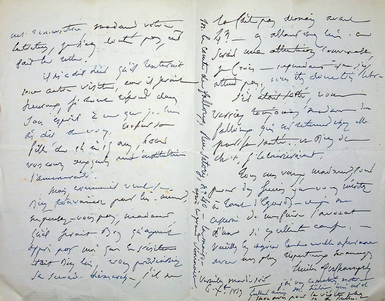 [ 3 L.A.S. adressées à Mlle Simone Arnaud Delage ] Lettre autographe signée de Camille Doucet, de l'Académie Française, 1 page à en-tête de l'Institut de France sous enveloppe marquée "Académie Française", datée du 25 mai 1885 : "Mademoiselle et chère confrère, Rien de plus touchant et de plus dramatique que votre Roche "Mengan", j'en suis encore tout ému & je m'empresse de joindre mes très sincères compliments aux remerciements que je vous dois pour votre bon et gracieux souvenir" ; Lettre autographe signée de Georges Monval, Bibliothécaire Archiviste de la Comédie Française, datée du 12 février 1883, 1 page sous enveloppe : "Mademoiselle, J'ai l'honneur de vous informer que, dans sa séance du 8 février, le Comité d'Administration du Théâtre Français a pris connaissance du rapport fait par la Commission d'examen sur votre comédie : "Mademoiselle du Vigean". J'ai en même temps le plaisir de vous annoncer que le Comité, s'associant aux conclusions de ce rapport, a réservé votre ouvrage pour l'envoyer devant le Comité de Lecture" ; Lettre autographe signée d'Albert Delpit, 4 pages sous enveloppe : "Mademoiselle, j'irai vous voir demain. [ ... ] Il est fort possible que je ne sois pas libre à 4 h ; mais plus tard. Et j'ai besoin de vous voir car j'ai des conseils importants à vous donner sur Jane Grey. Voulez-vous que nous admettions ceci ? Si vous ne receviez rien de moi, demain avant midi, c'est que j'irai rue St Pétersbourg [ ... ]