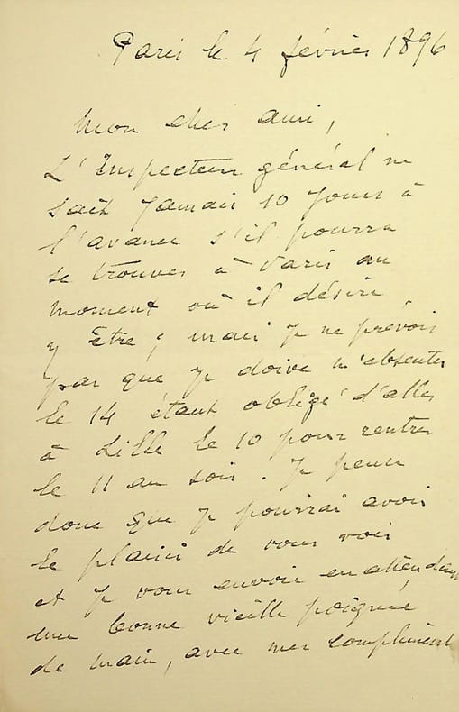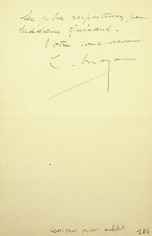 Constant Moyaux (1835-1911), architecte, grand prix de Rome 1861. L.A.S., Paris, 4 février 1896, 1p 1/2 in-8. Au poète Edouard Guinand (1838-1909). Il accepte une invitation pour le 14 tout en précisant qu'il y a un risque qu'il soit absent. [432]