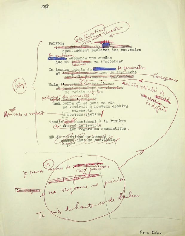 Pierre Béarn (1902-2004), poète, libraire, membre de l'école de Rochefort. Poème tapuscrit avec importantes corrections autographes, sd, 1p in-4. Poème non titré, vraisemblablement publié. Beau document [432]
