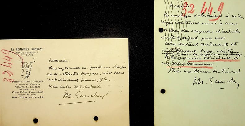 Maurice Gauchez (1884-1957), écrivain, poète belge. 2 L.A.S., 1932 & sd, 2p in-12. Deux courriers adressés à l'Argus de la Presse, l'un pour un paiement, l'autre pour une réclamation. Peu commun. [433]