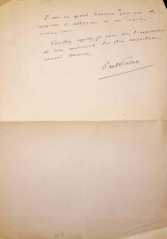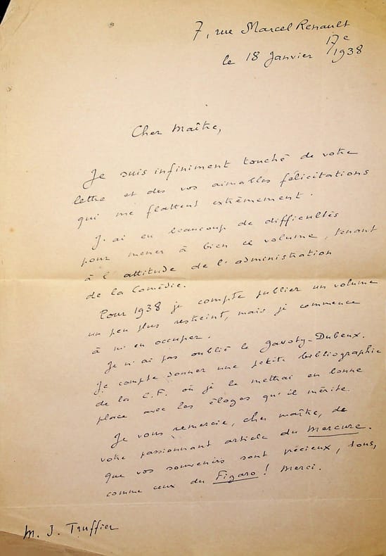 Paul Vinson (18..-19..), critique théâtral, juriste. L.A.S., 18 janvier 1938, 1p 1/4 in-4. A l'acteur Jules Truffier (1856-1943). Remerciements pour des félicitations pour un livre. Il s'agit très certainement du livre, pas encore paru, La comédie française : 1937, écrit par Edouard Champion mais terminé par Paul Vinson (il est publié après la mort de Champion en 1938). Champion avait déjà publié plusieurs volumes. [433]