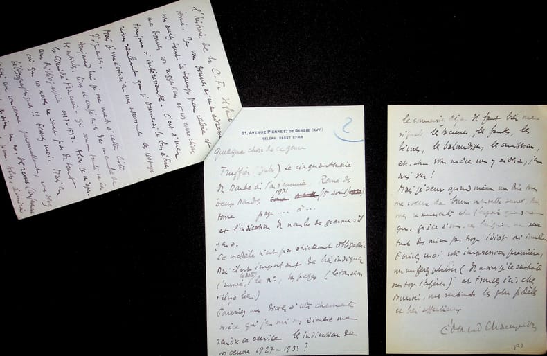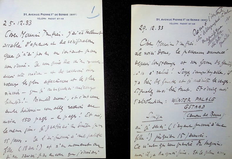 Edouard Champion (1882-1938), écrivain, libraire, éditeur. 2 L.A.S., 25 & 29 décembre 1933, 6p in-8. A l'acteur Jules Truffier (1856-1943). Belles lettres au ton amical, au moment où il relit les épreuves de son volume sur la Comédie française. Il souhaite les envoyer à Truffier pour qu'il les relit aussi. Il donne son adresse en Suisse où il part 15 jours., voeux pour la nouvelle année. Les deux feuillets de la lettre de 4p ont été collés à l'angle. [433]